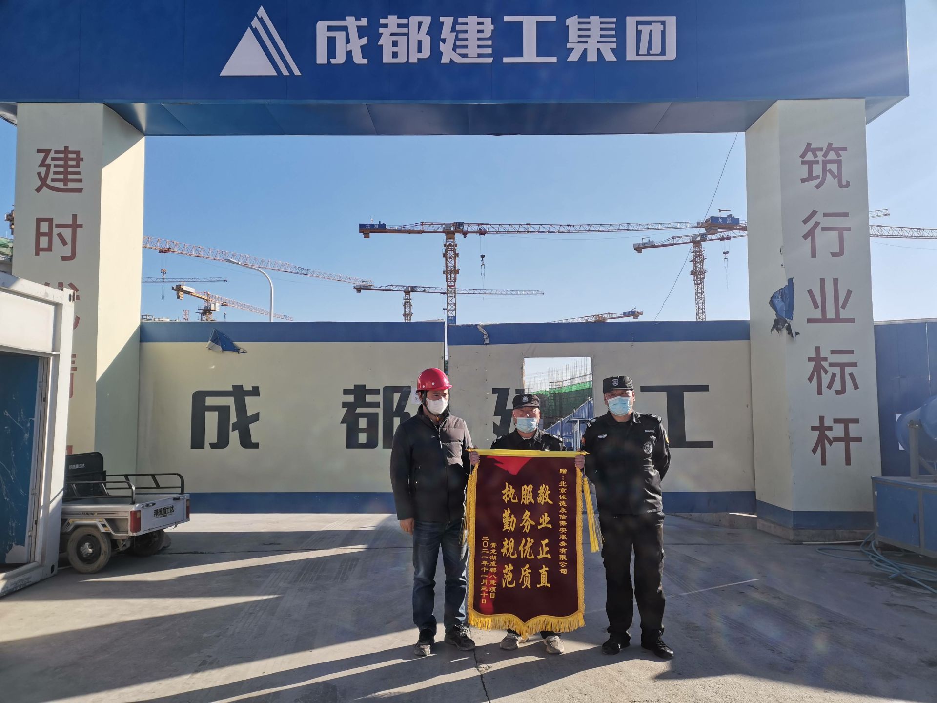 2021年11月30日,我司驻青龙湖成都建工第八建筑工程有限公司房山分公司保安队收到甲方赠予的锦旗“ 执勤规范 服务优质 敬业正直”。